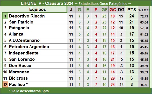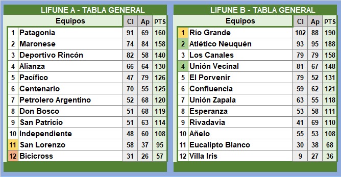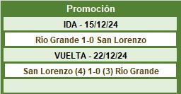La última posición de la A está ocupado por el equipo que ya descendió por tanto San Lorenzo juega la promoción frente a Río Grande por un lugar en la categoría A.